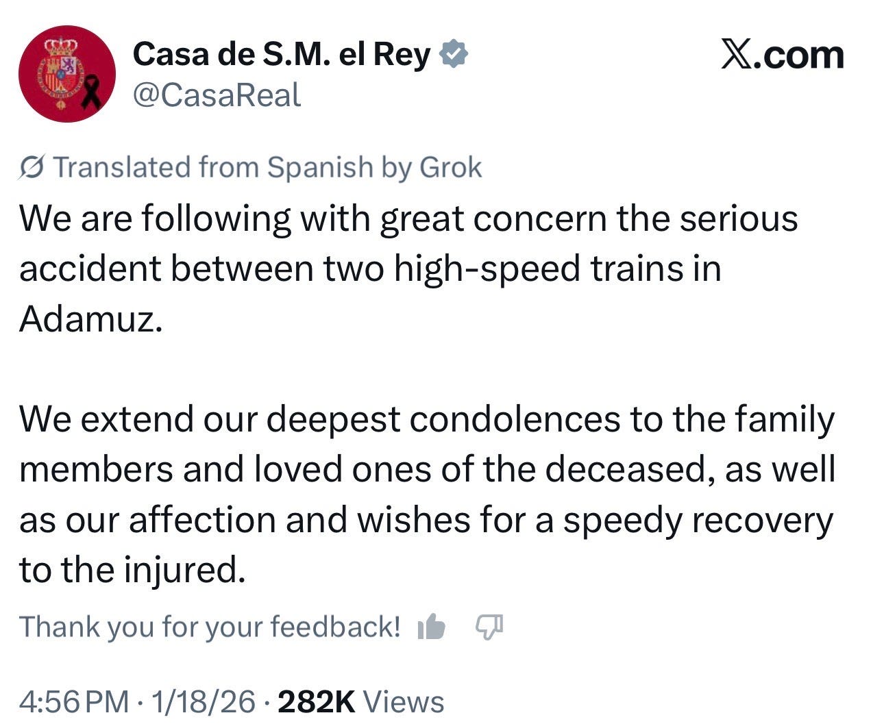 “We extend our deepest condolences to the families and friends of the deceased, as well as our affection and wishes for a speedy recovery to the injured,” the palace wrote on X.