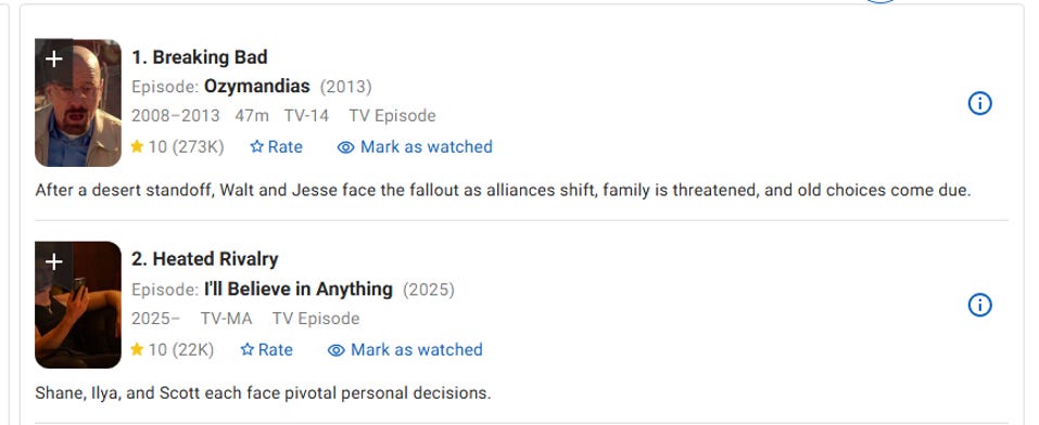 After Episode 5 aired in December, it briefly tied with Breaking Bad’s series finale, which aired in 2013, as the only television episodes to receive a 10 out of 10 rating on IMDb.