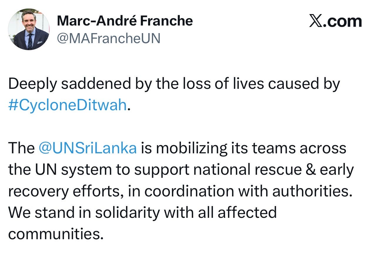 “Deeply saddened by the loss of lives caused by #CycloneDitwah,” wrote UN Resident Coordinator Marc-André Franche on X.