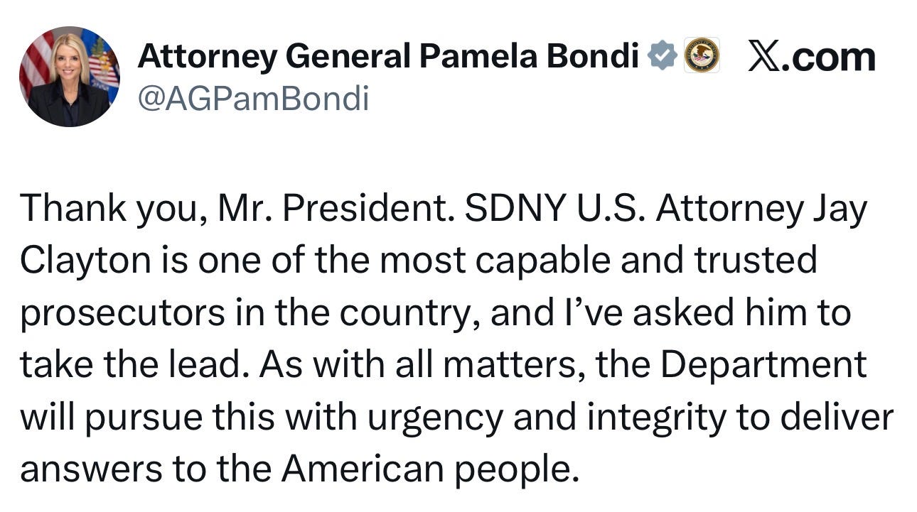 Attorney General Pam Bondi wrote on X that she asked attorney Jay Clayton—who represents the Southern District of New York—to lead the investigation.