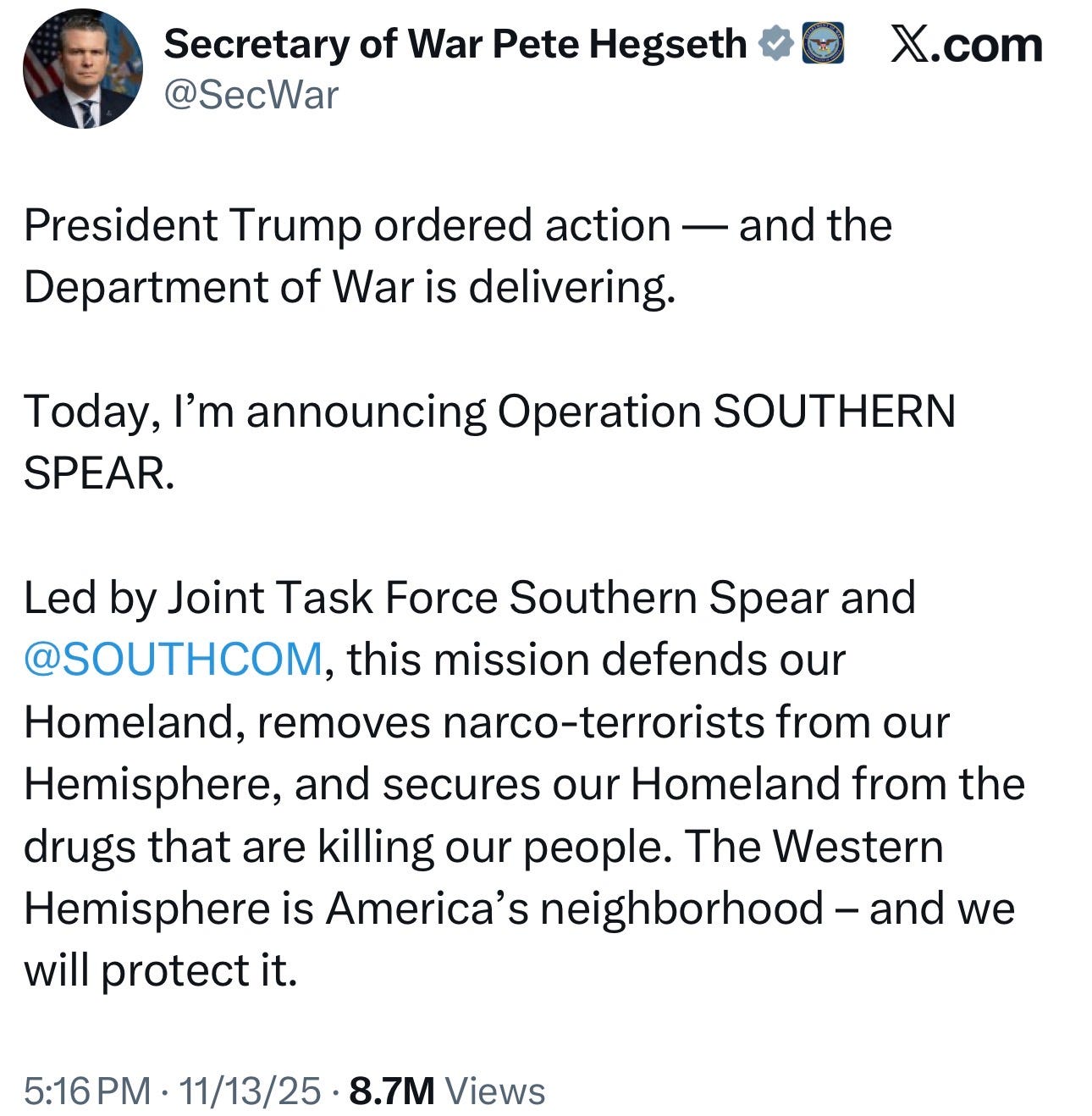 “Led by Joint Task Force Southern Spear and @SOUTHCOM, this mission defends our homeland, removes narco-terrorists from our hemisphere, and secures our homeland from the drugs that are killing our people,” he continued.