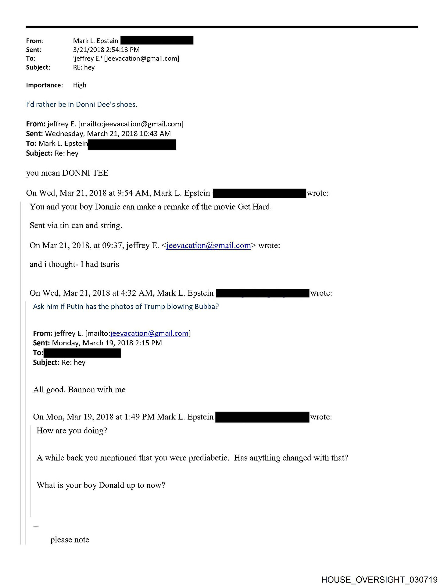 Another email released by the House Oversight Committee alleged that President Trump had sexual relations with Bill Clinton, with Russian President Vladimir Putin being aware of it.