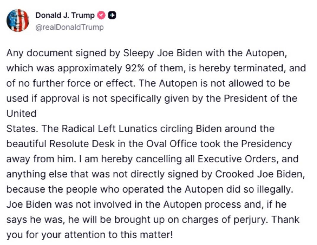 “Any document signed by Sleepy Joe Biden with the autopen, which was approximately 92% of them, is hereby terminated, and of no further force or effect,” he wrote on Truth Social.