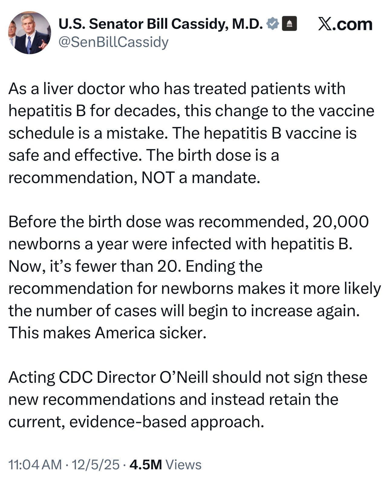 “Ending the recommendation for newborns makes it more likely the number of cases will begin to increase again,” he wrote on X.