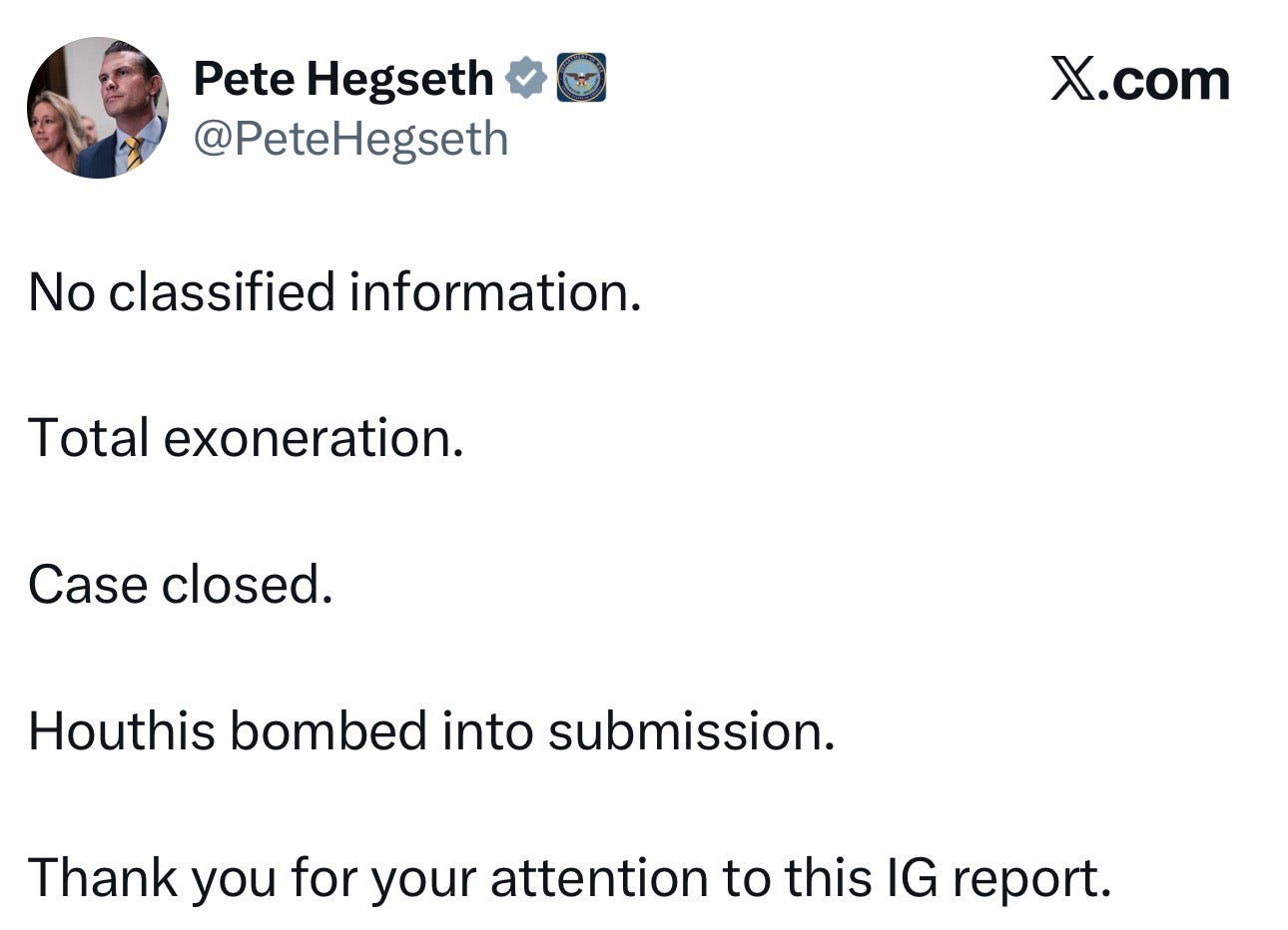 “No classified information. Total exoneration. Case closed. Houthis bombed into submission. Thank you for your attention to this IG report,” he wrote.