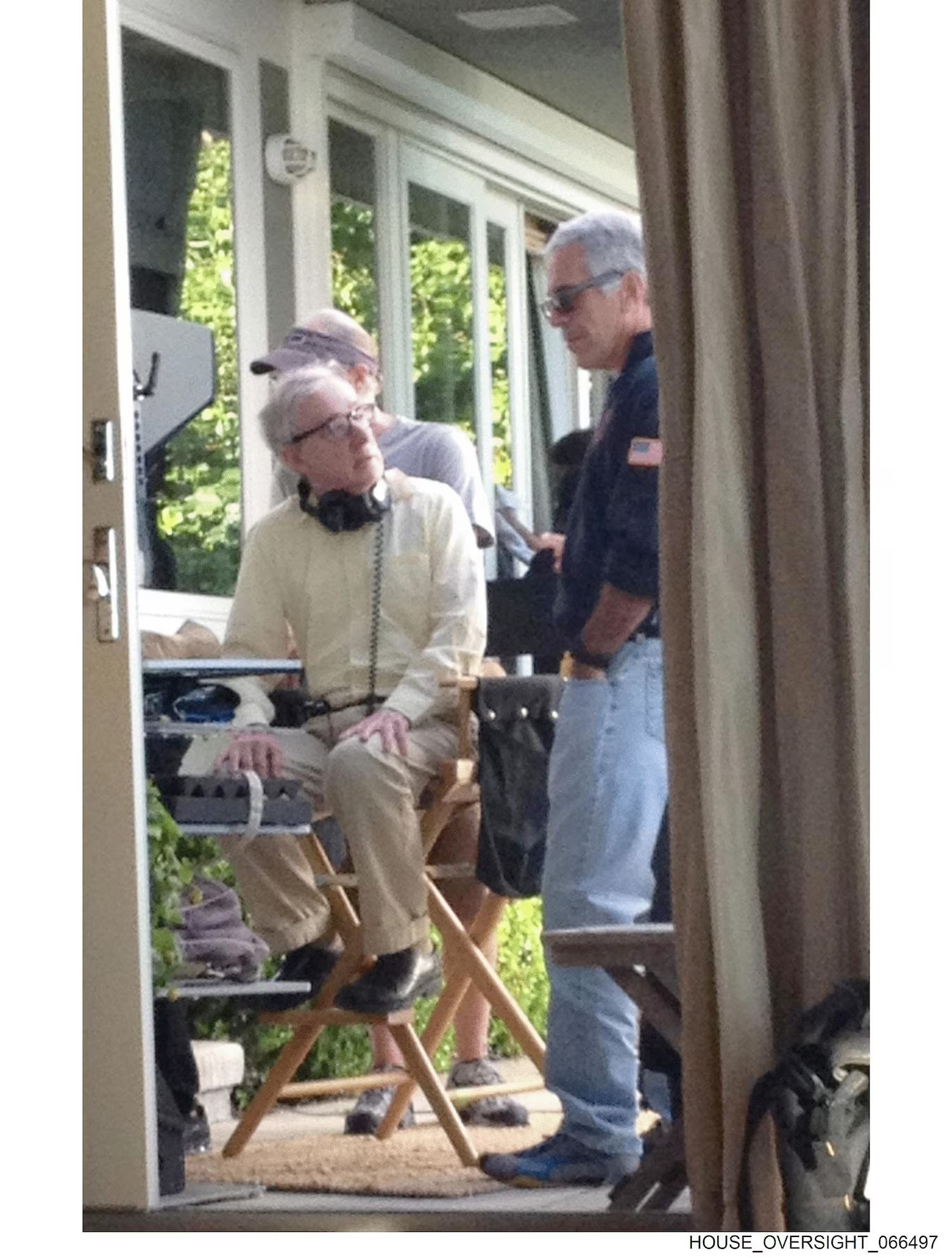 Another photo shows director Woody Allen speaking to Epstein on a film set, with Epstein looking into a video monitor.