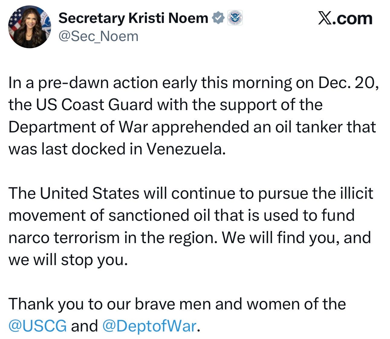 “The United States will continue to pursue the illicit movement of sanctioned oil that is used to fund narco terrorism in the region. We will find you, and we will stop you,” Department of Homeland Security Secretary Kristi Noem wrote on X.
