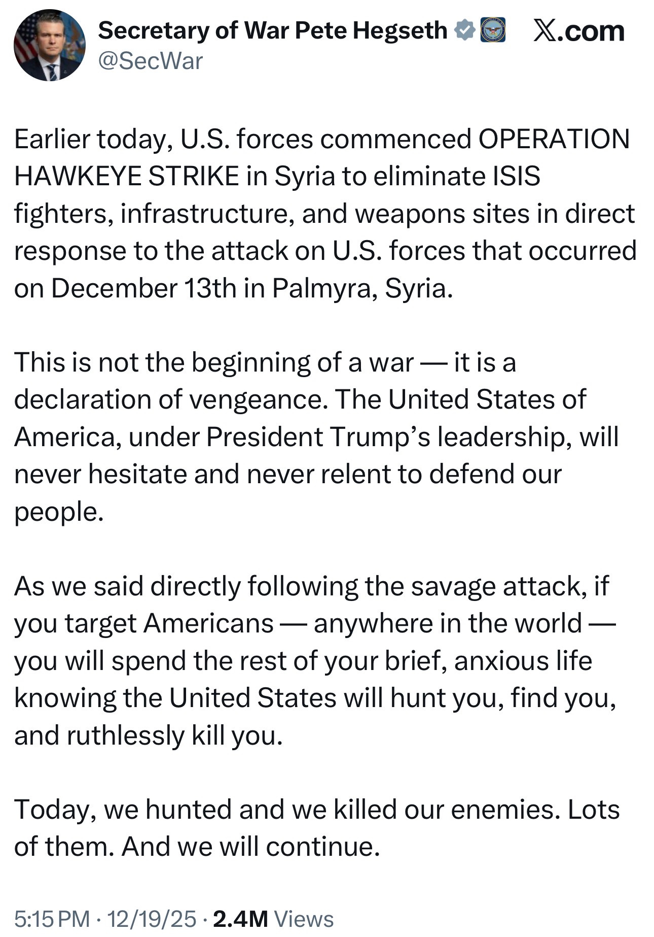 “Earlier today, U.S. forces commenced OPERATION HAWKEYE STRIKE in Syria to eliminate ISIS fighters, infrastructure, and weapons sites in direct response to the attack on U.S. forces that occurred on December 13 in Palmyra, Syria,” he wrote.