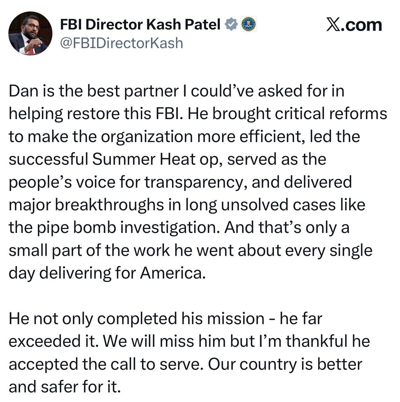 “I want to thank President Trump, AG Bondi and Director Patel for the opportunity to serve with purpose. Most importantly, I want to thank you, my fellow Americans, for the privilege to serve you.”