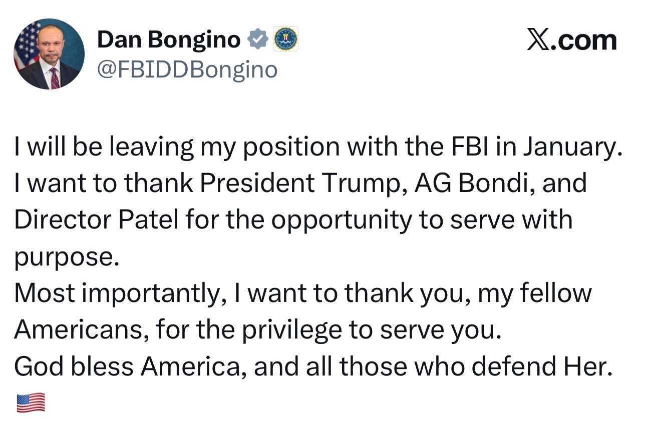 Meanwhile, FBI Deputy Director Dan Bongino announced he would be stepping down from his position in January.