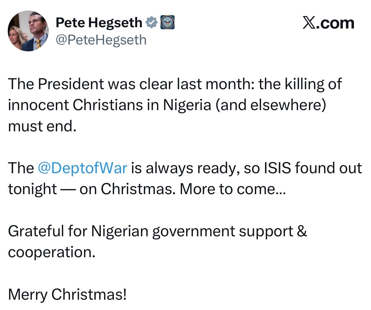 “The @DeptofWar is always ready, so ISIS found out tonight—on Christmas. More to come… Grateful for Nigerian government support & cooperation.”