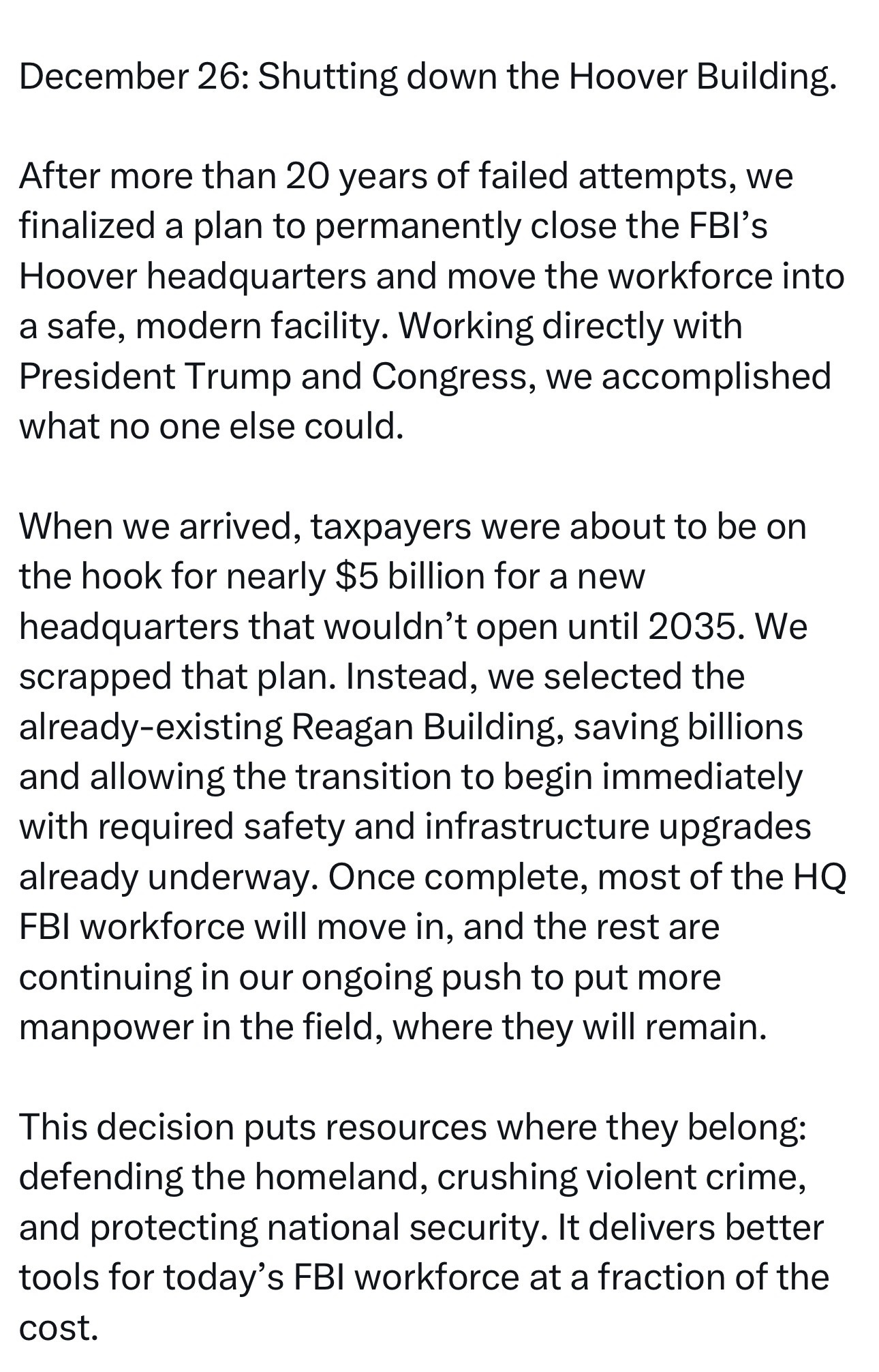 “After more than 20 years of failed attempts, we finalized a plan to permanently close the FBI’s Hoover headquarters and move the workforce into a safe, modern facility. Working directly with President Trump and Congress, we accomplished what no one else could,” Patel wrote on X.