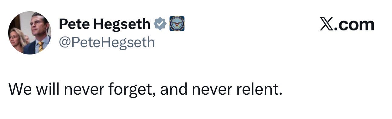 In a post on X, Defense Secretary Pete Hegseth celebrated the strikes, writing, “We will never forget, and never relent.”