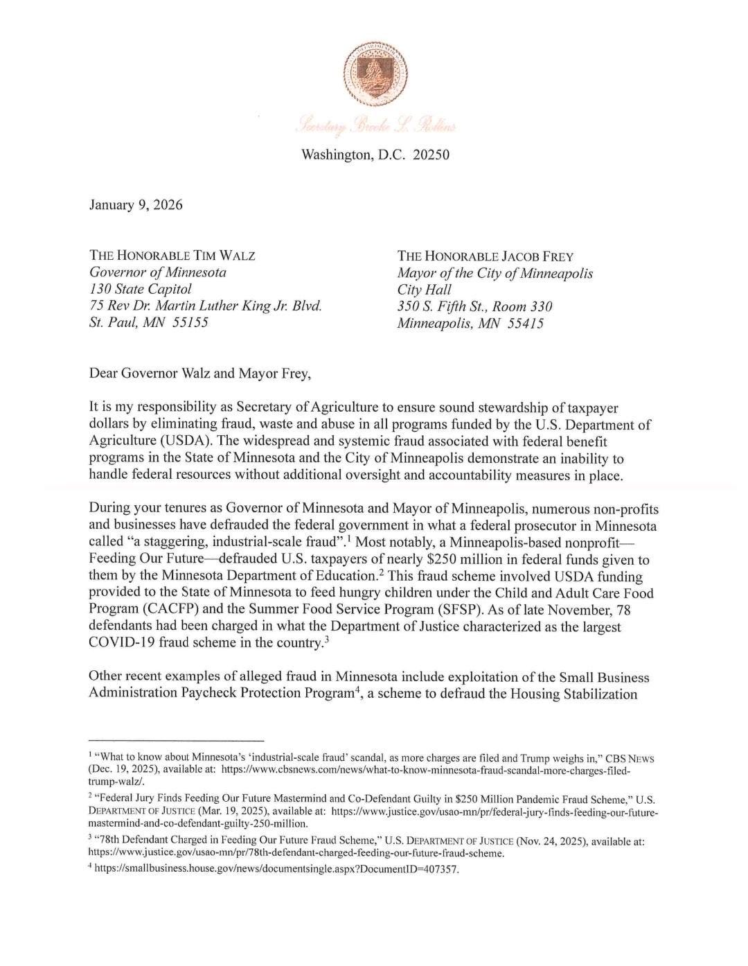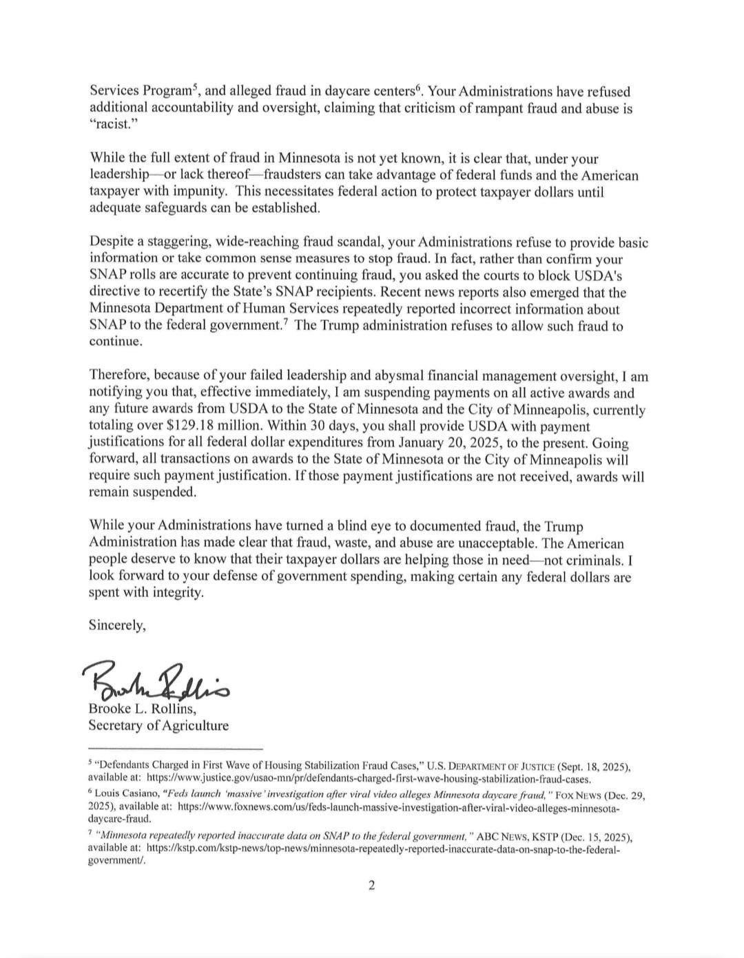 “Despite a staggering, wide-reaching fraud scandal, your administration refuses to provide basic information or take common-sense measures to stop fraud,” Agriculture Secretary Brooke Rollins wrote in a letter posted to X.