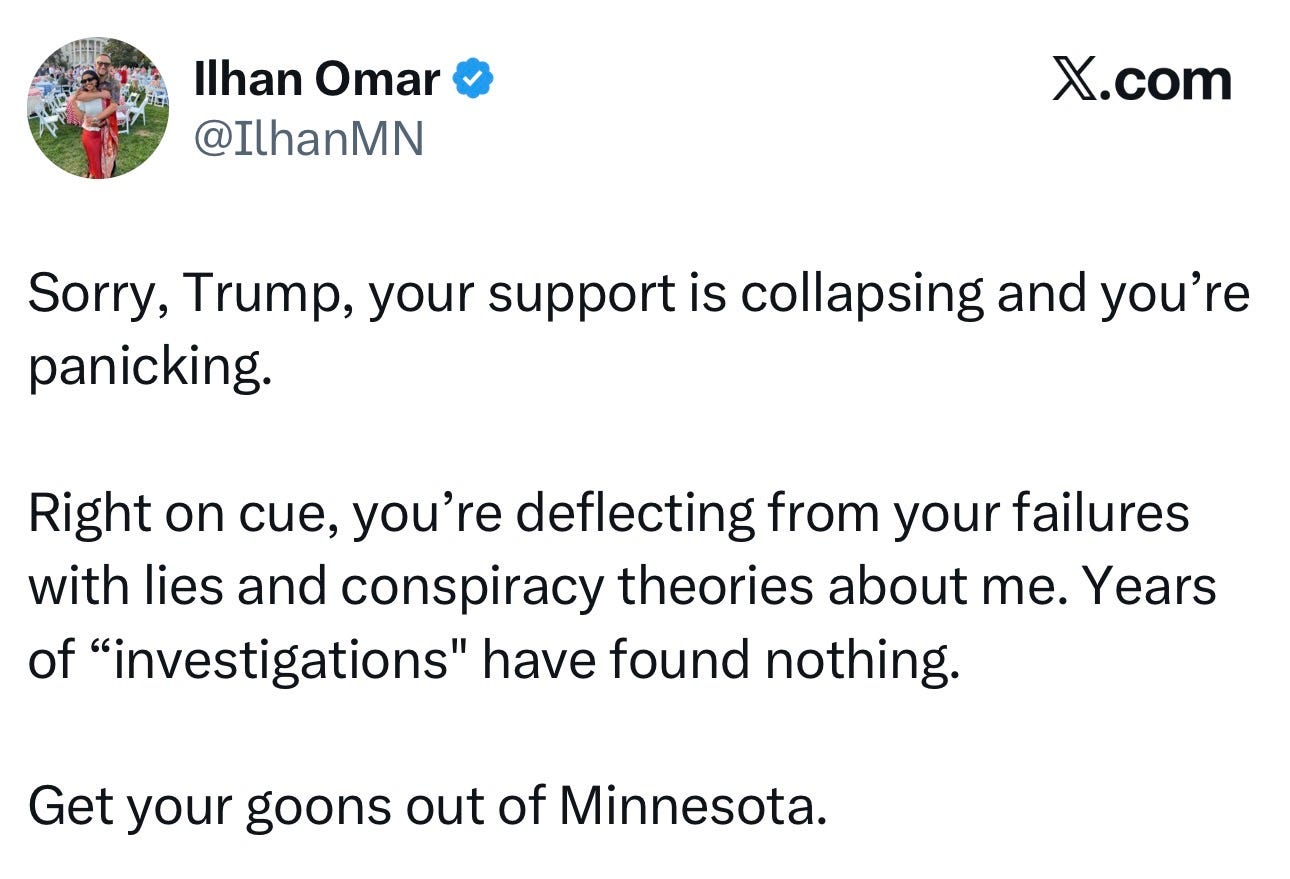 Omar responded to Trump’s claims on X, saying his support is “collapsing” and that he is “panicking.”