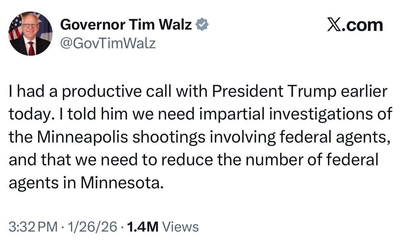 “I told him we need impartial investigations of the Minneapolis shootings involving federal agents, and that we need to reduce the number of federal agents in Minnesota,” Walz wrote.