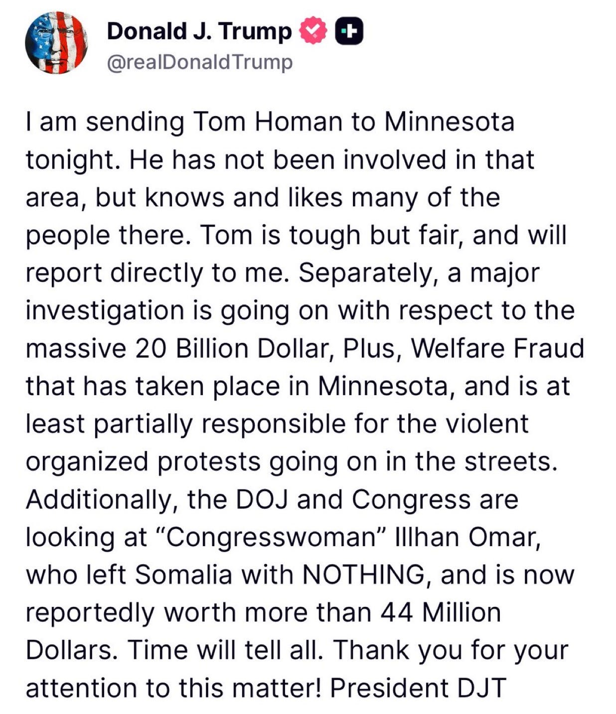 “I told Governor Walz that I would have Tom Homan call him, and that what we are looking for are any and all criminals that they have in their possession,” Trump wrote, referring to Minnesota Gov. Tim Walz, adding that the two had a “very good call” and were on a “similar wavelength.”