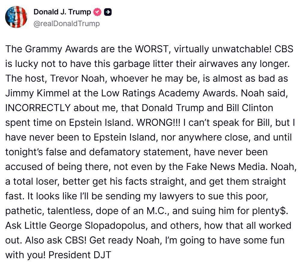 “That is a Grammy that every artist wants almost as much as Trump wants Greenland,” Noah said.