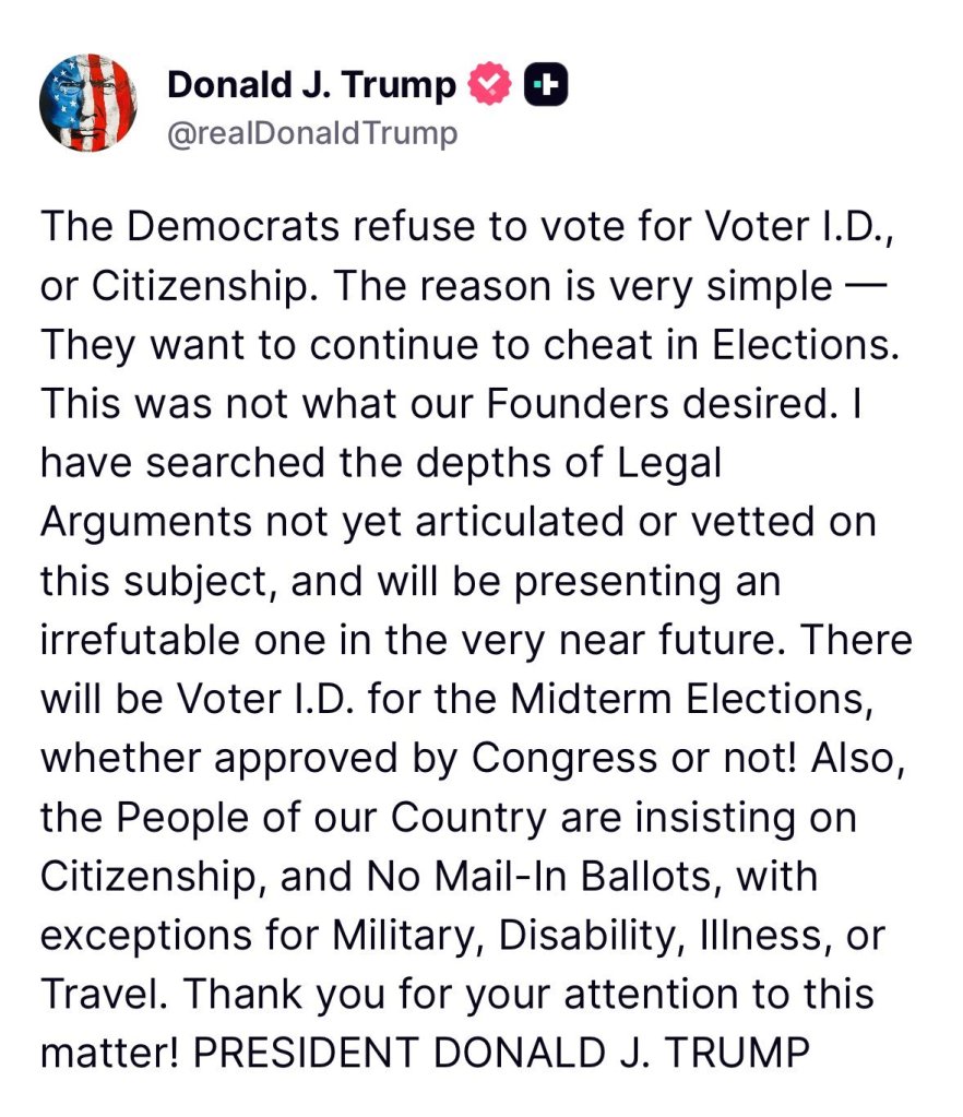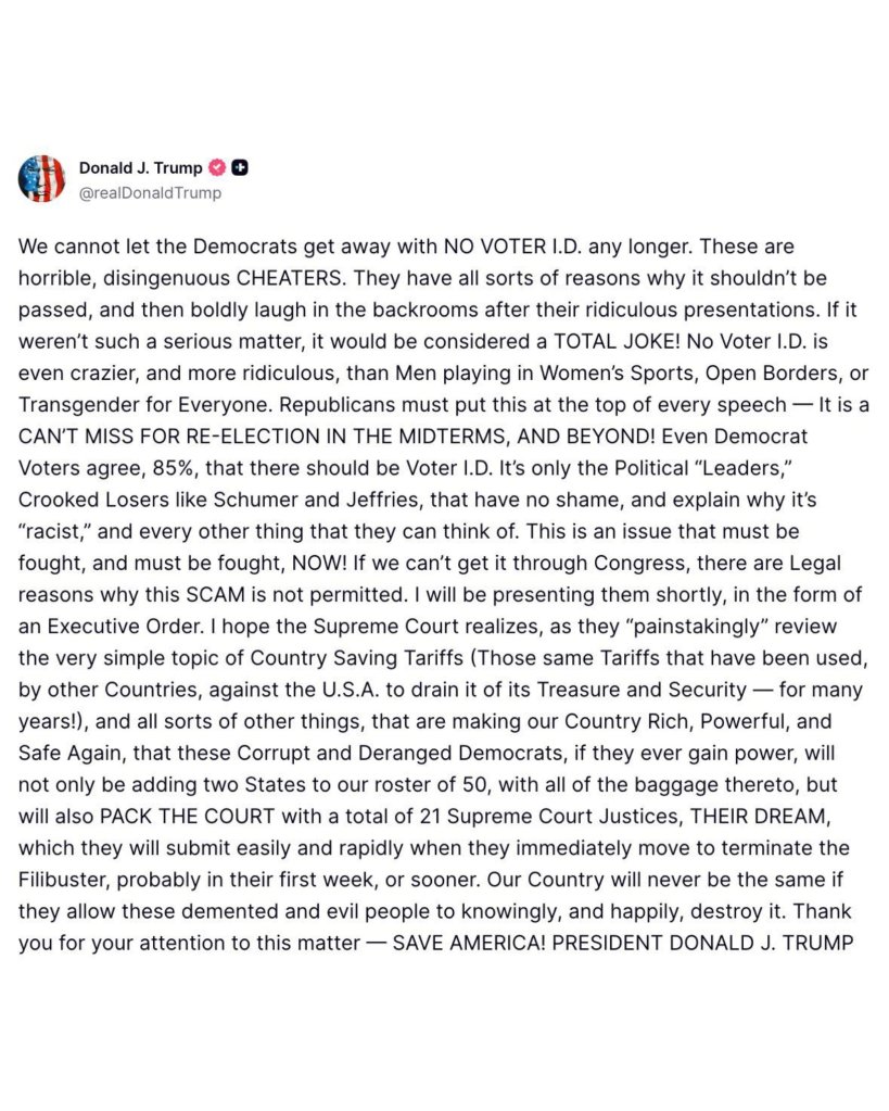 “There will be Voter I.D. for the Midterm Elections, whether approved by Congress or not!” he wrote to Truth Social.