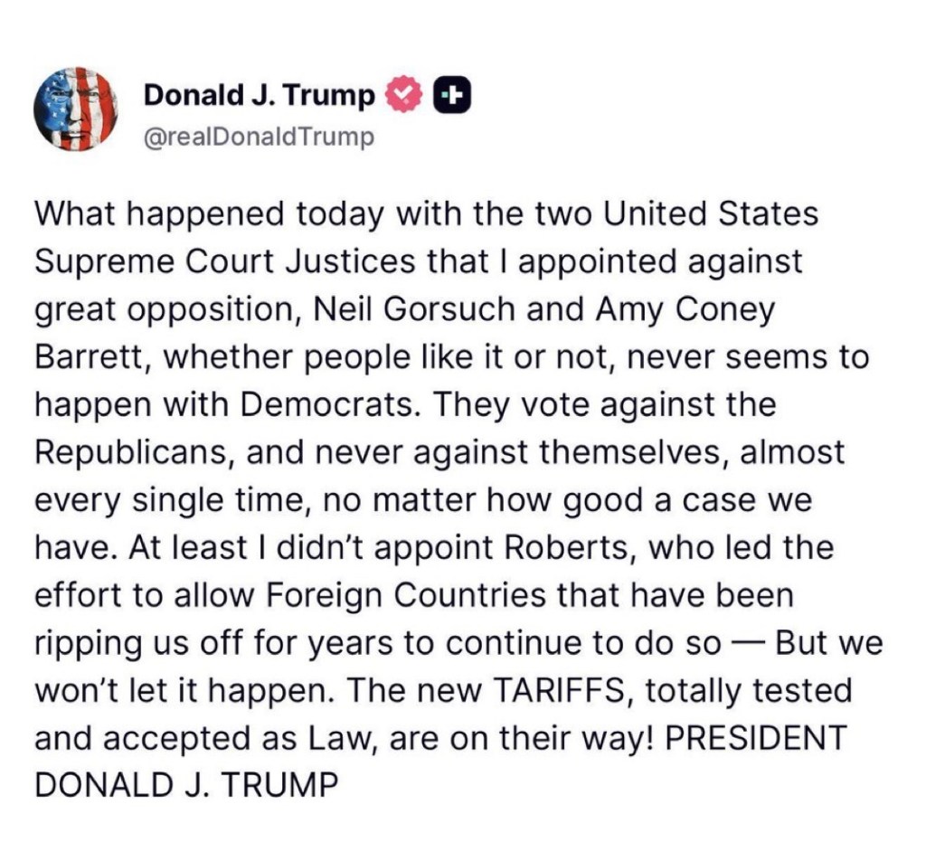 “The Supreme Court’s ruling on tariffs is deeply disappointing, and I’m ashamed of certain members of the court, absolutely ashamed for not having the courage to do what’s right for our country,” he said.