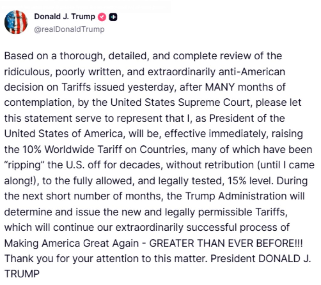 “I, as President of the United States of America, will be, effective immediately, raising the 10% Worldwide Tariff on Countries, many of which have been ‘ripping’ the U.S. off for decades, without retribution (until I came along!), to the fully allowed, and legally tested, 15% level,” he wrote on Truth Social.