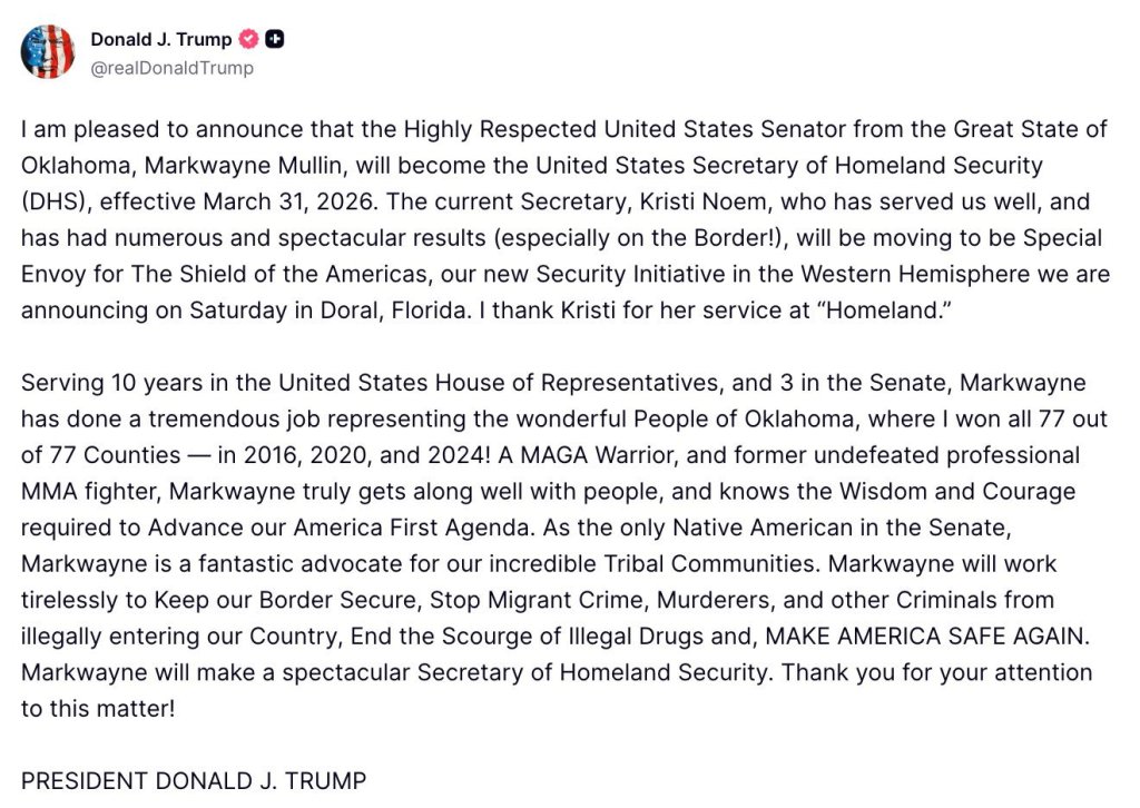 “I am pleased to announce that the Highly Respected United States Senator from the Great State of Oklahoma, Markwayne Mullin, will become the United States Secretary of Homeland Security (DHS), effective March 31, 2026,” he wrote.