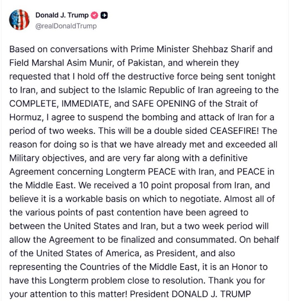 “I agree to suspend the bombing and attack of Iran for a period of two weeks. This will be a double-sided CEASEFIRE! The reason for doing so is that we have already met and exceeded all Military objectives, and are very far along with a definitive Agreement concerning Longterm PEACE with Iran, and PEACE in the Middle East.”